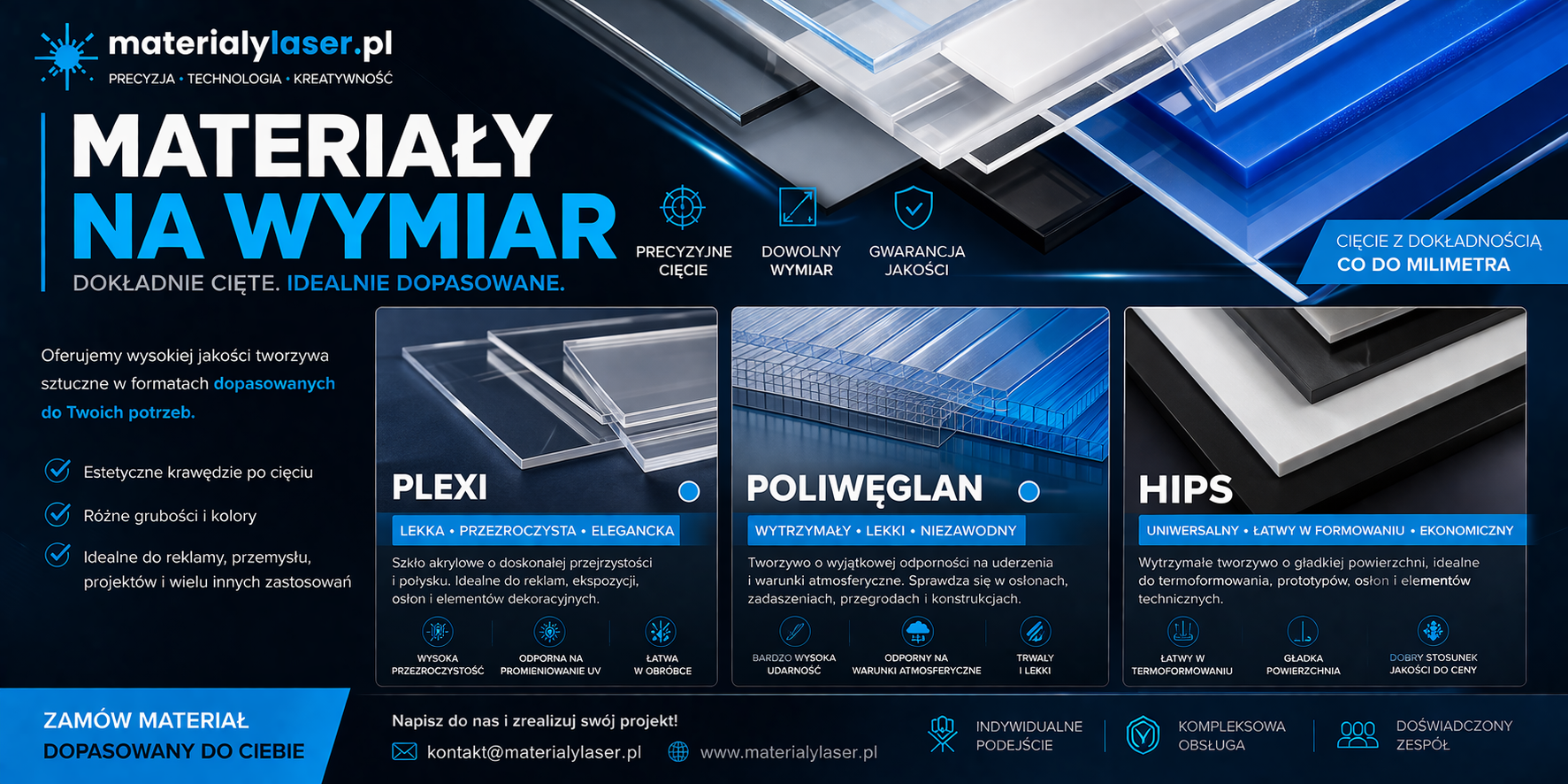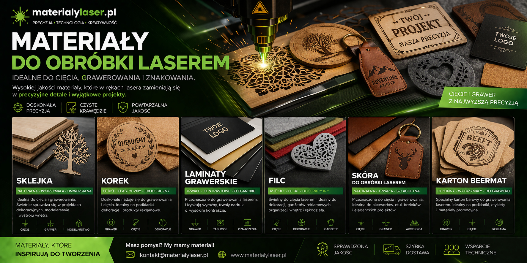 Jesteśmy założoną w 2020 roku firmą z Warszawy oferującą szeroką ofertę tworzyw sztucznych oraz materiałów do obróbki laserowej. W naszej ofercie znajduję się plexi (PMMA) renomowanego producenta Roehm, sklejka, korek, laminaty grawerskie, skóry do cięcia laserowego, filce czy drewno.